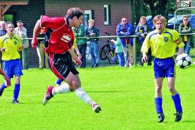 ![]() Lehmkes 2:0: TSV-Torjäger Benjamin Müller nimmt den Ball volley, Eddelstorfs Andreas Burmester (r.) staunt nur. Foto: mk |