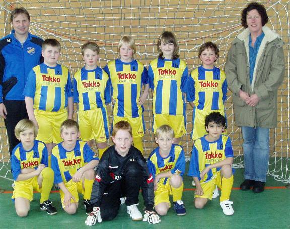 Im vergangenen Herbst haben zahlreiche SVE-Fans und vor allem Eltern unserer Jugendspieler an einer Verlosung der Firma Takko teilgenommen. Das Modeunternehmen verloste insgesamt 16.000 Trikotsätze für Jugendmannschaften. Eine der glücklichen Gewinner ist Margit Burmeister, die Ihren Trikotsatz unserer E-Jugend gespendet hat. Das Foto zeigt die Spenderin und die nun besonders gut gekleidete E-Jugend mit ihrem Trainer Burkhärd Hänel bei einem Hallenturnier.