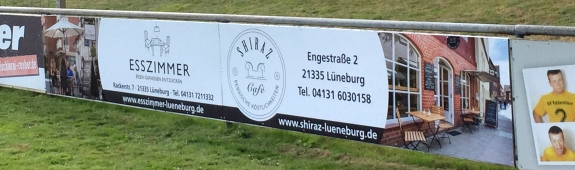 Die SVE-Fans werden es am Sonntag sehen: Drei Unternehmen aus der Region werben nun mit einer Werbebande am Königskamp. Das Café Shiraz und das kleine Restaurant Esszimmer im Herzen Lüneburgs gehören unserem langjährigen Spieler Sasan Khojandi und er freut sich über jeden blau-gelben Besucher.