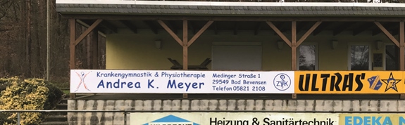 2017 war ein tolles Jahr, was die Werbung am Königskamp angeht. Nicht weniger als sieben neue Banden wurden rund um den Sportplatz angebracht. Den Abschluss bildete die neue Bande von Andrea Meyer. Andrea wirbt für ihre Krankengymnastik- und Physiotherapiepraxis in Bad Bevensen mit einer Bande, die direkt an der Haupttribüne vor dem Vereinsheim angebracht ist. Wir freuen uns sehr darüber, dass Andrea nun also sowohl mit einer Anzeige in der Stadionzeitung als auch mit einer Bande für ihre Praxis wirbt. Andrea und ihrem Team wünschen wir für die Zukunft alles Gute und sagen Danke für die neue Bande. Wir empfehlen allen Mitgliedern und Fans des SVE, die Dienste unserer regionalen Partner in Anspruch zu nehmen! |