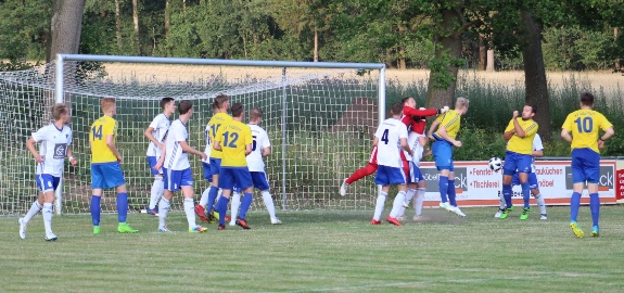 Heute traf unsere Mannschaft auf den TuS Bodenteich, gegen den wir in der Vergangenheit meistens wenig Zählbares holen konnten. Beide Teams mussten auf einige Akteure verzichten, konnten aber gute Mannschaften ins Rennen schicken. Nach einem kurzen Abtasten hatte Bodenteich zunehmend Übergewicht und spielte ansehnlich nach vorne. Unsere neu formierte Viererkette musste sich zunächst finden und hatte sichtliche Probleme. In der 17. Minute fiel das 0:1. Nach einer Ecke standen zwei Bodenteicher komplett blank; Fabian Hänel konnte zunächst noch parieren, aber dann entschied der Unparteiische nach einem Foul von Tim Hänel auf Strafstoß. Diesen verwertete Kim Winter zur Führung. In der 23. Minute fiel dann der etwas überraschende Ausgleich, da unsere Offensivaktionen bis dahin sehr ungefährlich waren. Malte Meyer verwandelte einen direkten Freistoß aus knapp 22 Metern Entfernung. Nur fünf Minuten später mussten wir das 1:2 durch Lennart Williges hinnehmen. Fabian Hänel klärte einen Ball von außen nicht konsequent und Williges überlupfte ihn zur erneuten Bodenteicher Führung. Einige Minuten später hätte es dann Strafstoß für uns geben müssen nach einem Foul an Malte Meyer, der Unparteiische ließ jedoch weiter spielen. In der 39. Minute gab es dann jedoch einen Stafstoß für uns. Dieses "Foul" an Stefan Kaßmann hätte man nicht unbedingt pfeifen müssen; Malte Meyer verwandelte trotzdem sicher zum 2:2, mit dem es auch in die Kabinen ging. Diese Führung war für uns etwas schmeichelhaft, da Bodenteich eine starke erste Halbzeit gespielt hatte und die reifere Spielanlage hatte. Es spielte uns zusätzlich in die Karten, dass der Bodenteicher Kapitän Steffen Daug Mitte der ersten Halbzeit ausgewechselt werden musste. Bis dahin war er Chef der Bodenteicher Viererkette und machte ein starkes Spiel. |
