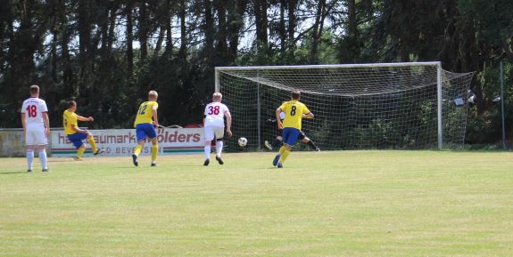 Bei hohen Temperaturen war auf beiden Seiten nicht das ganz hohe Tempo zu erwarten und dem wurden beide Teams auch gerecht. Von Beginn an strahlte unsere Offensive Gefahr aus, nahm aber beim 1:0 in der 14. Minute gerne ein Geschenk der Neetzer an. Der Neetzer Abwehrspieler Alexander Wetjen spielte unbedrängt einen Rückpass auf seinen Keeper Lars Vogt, allerdings so ungenau, dass der Ball ins eigene Tor trudelte. Nur zwei Minuten später traf Robin Wanke zum 2:0. Er verwandelte einen Strafstoß nach einem Foul an Thiemo Hauer (siehe Foto oben). In der Folge vergaben wir weitere gute Chancen zu einer höheren Führung und Neetze vergab zunächst eine sehr gute Chance, die Tobias Godglück stark abwehren konnte. In der 43. Minute fiel dann das etwas überaschende 2:1 für Neetze, die sich über außen auf unserer linken Seite durchsetzen konnten und so wieder für Spannung sorgten.