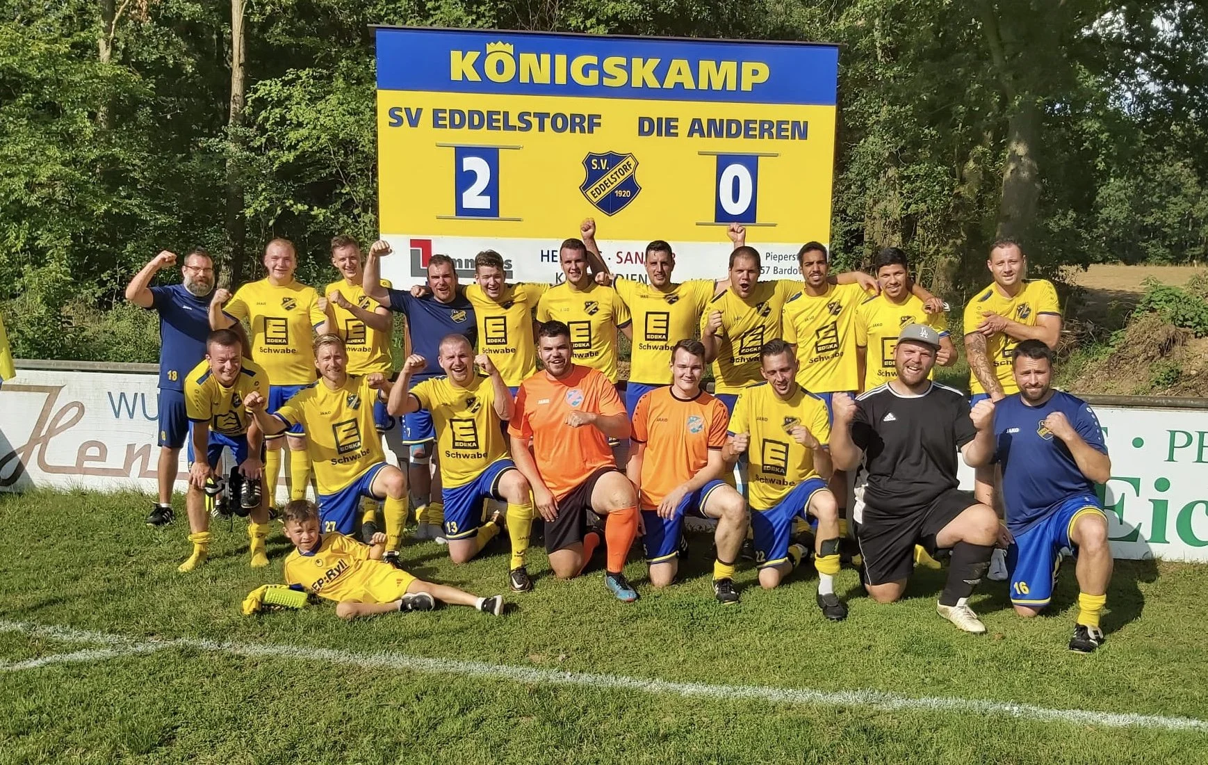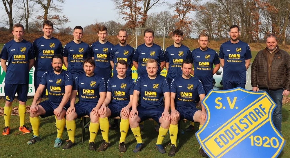 Hinten von links: Torben Perau, Tobias Wendt, Lukas Müller, Max Wendt, Florian Prüser, Hannes Krambeer, Moritz Niehoff, Jon Kobbeloer, Trainer Jan-Erik Körner, Sponsor Axel Krambeer (LVM Versicherung)