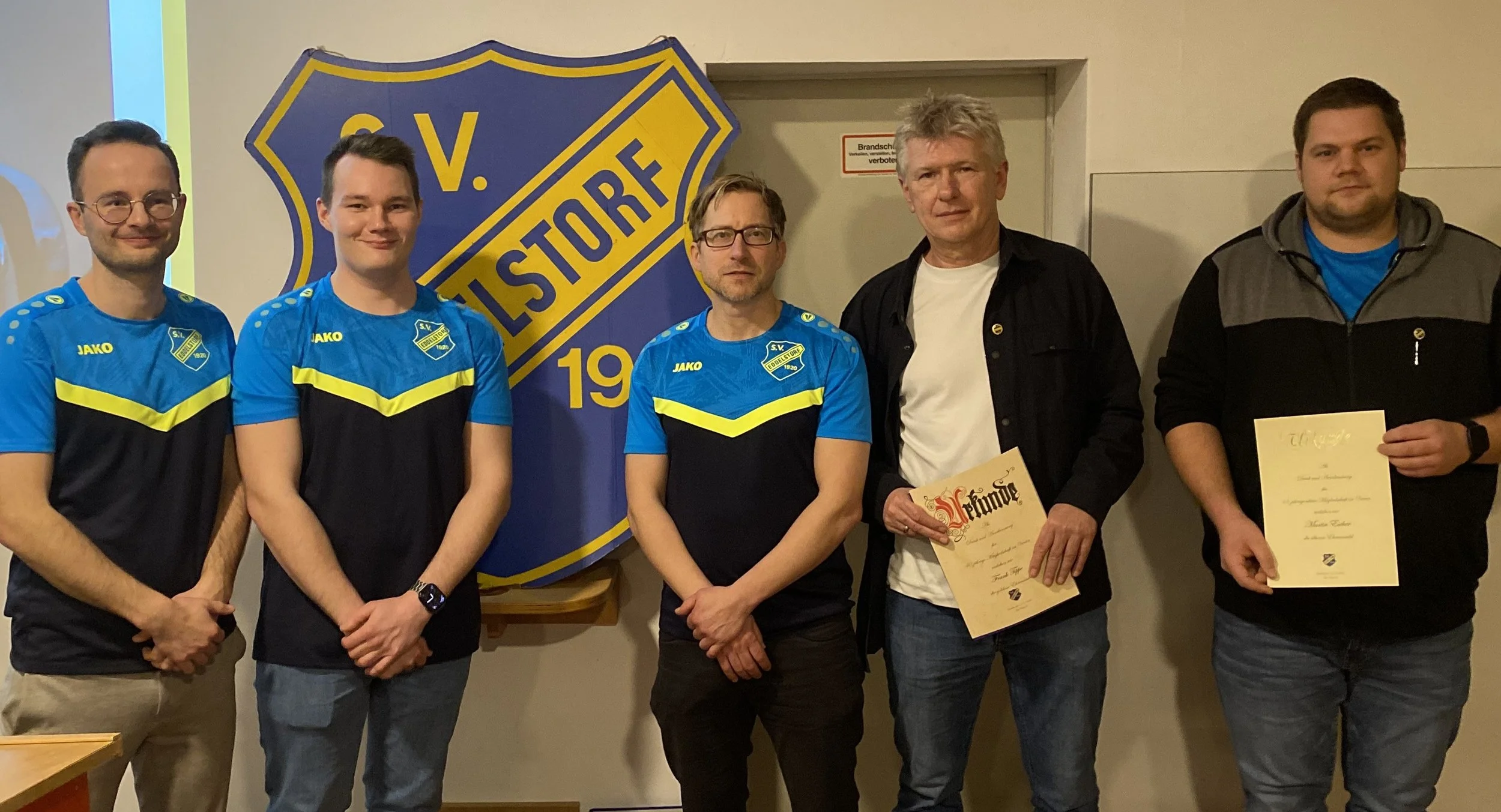 Nach der Entlastung des Vorstandes, die vom ehemaligen ersten Vorsitzenden Michael Strzalla beantragt und von der Versammlung beschlossen wurde, standen die Ehrungen auf der Tagesordnung: Die goldene Ehrennadel für 40-jährige Mitgliedschaft wurde an Frank Tippe verliehen. Die silberne Ehrennadel für 15-jährige aktive bzw. 20-jährige Mitgliedschaft verlieh der Vorstand an Martin Escher, Julian Hänel und Maik Wieczorek.